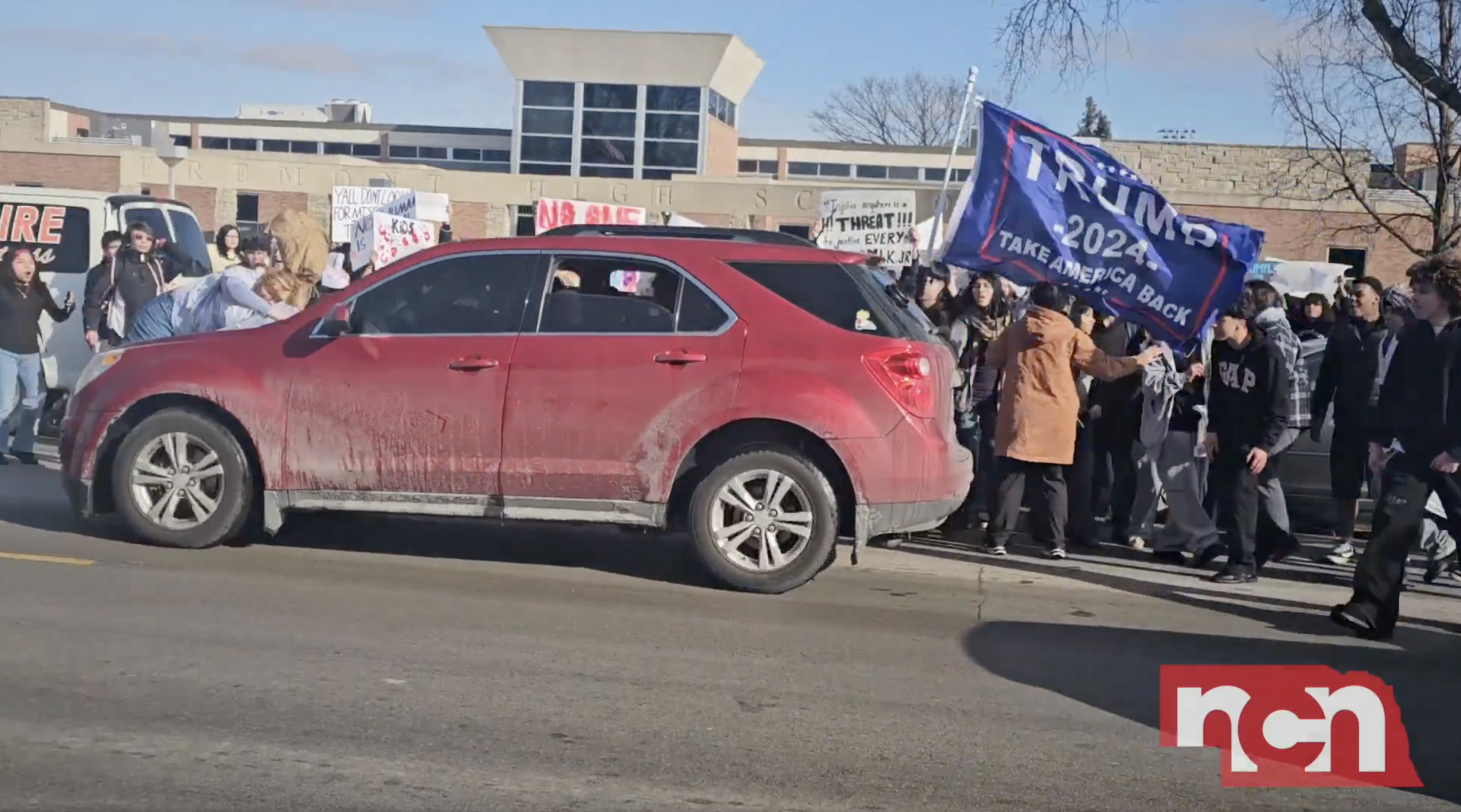 FREMONT, NE — A student-led demonstration against federal immigration enforcement turned violent Thursday afternoon when a red SUV, adorned with a flag supporting President Trump, struck a student protester before fleeing the scene.